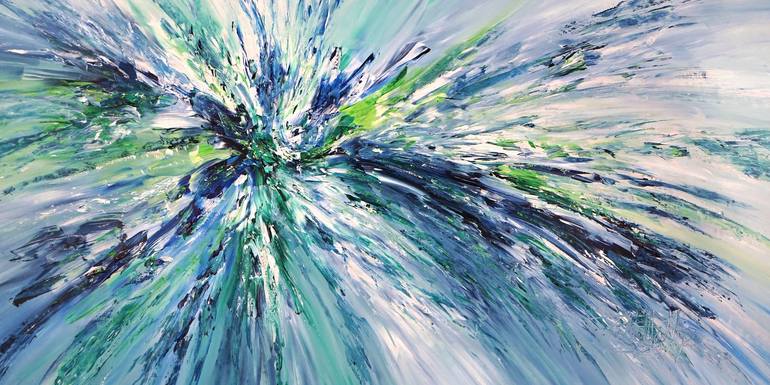Large abstract painting. Original abstract expressionism art. 78.8" width x 39.4" height x 1.5" depth. (200 cm Breite x 100 cm Höhe x 3,8 cm Keilrahmenstärke) Original painting. Modern, dynamic abstract artwork. Blue, turquoise, green, white. It was painted with professional acrylic paint on can...