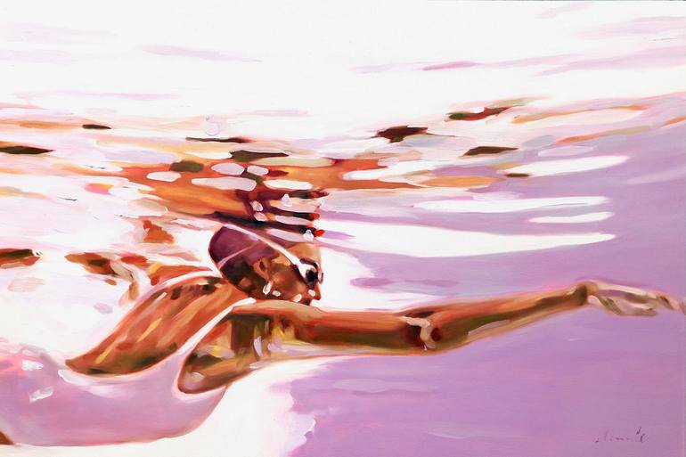 I paint images of figures in and around water - in pools, oceans and lakes. Many of these, including this painting, are imagined self-portaits.