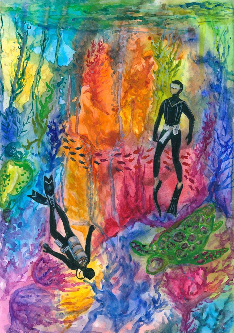 The magical and diverse underwater world is explored by two divers, a large green turtle swims past, the play of shadows and rainbow light on corals and reefs is mesmerizing. Diving in the Red Sea to explore the seabed, observing marine life inspired me to create this colorful watercolor painting.