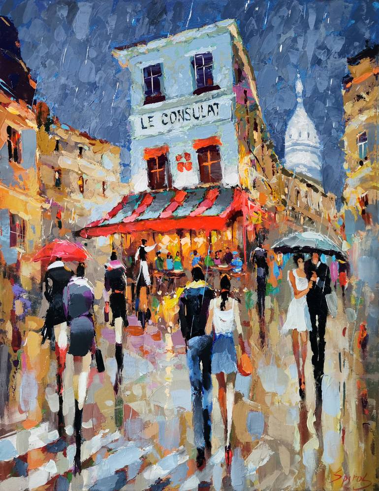 Unexpected rain - oil on canvas painting by Dmitry Spiros size -29" x 22.5" (74cm x 57cm), 2022 In the evening, Paris takes on a completely different appearance. Paris is immersed in the evening illumination, which makes it even more romantic and fabulous.
