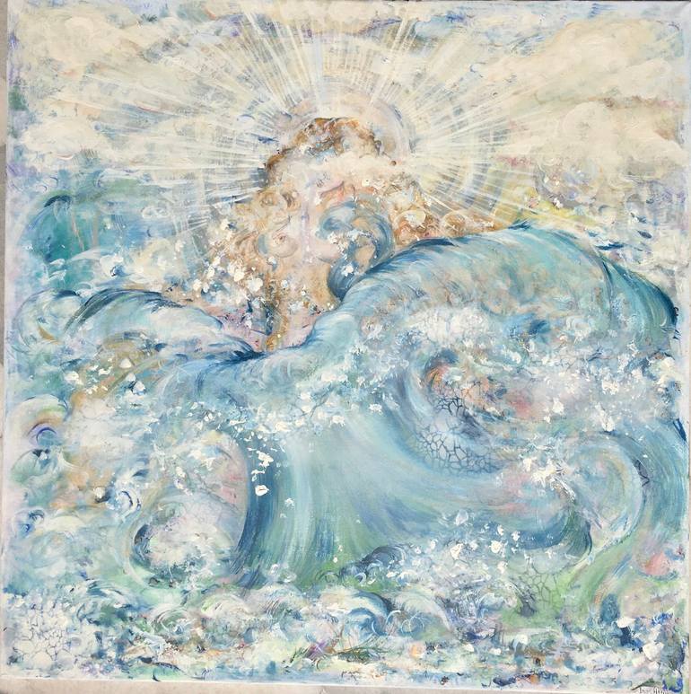 This original artwork captures the mythical birth of Aphrodite, a manifestation of the sea's mystical power. The enchanting process unfolds as clouds, sea foam, water, light, and love converge. The artist's imagination results in a light, blue, frothy, and cloudy canvas, accented with striking gold ...
