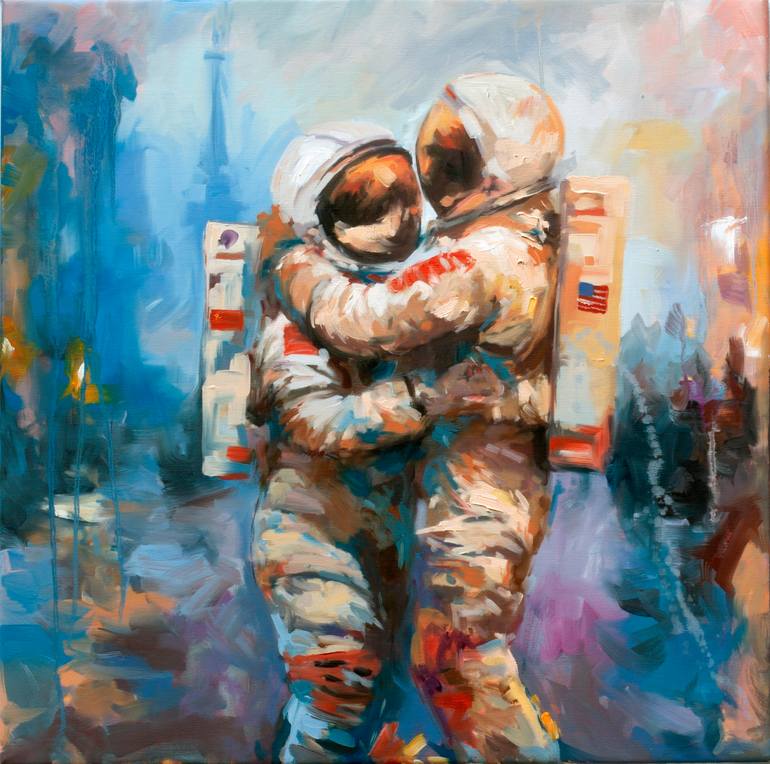 "Universal Love" is a poignant 70x70 cm oil painting by Alexandr Klemens, portraying the secret romance of two introverted astronauts journeying through the cosmos. Hailing from different cultures, their love defies societal norms, capturing the essence of forbidden affection in a universe vast and ...