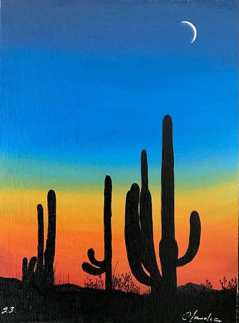 Esta pintura vibrante, titulada "Unthougths", te invita a un viaje visual lleno de optimismo. El atardecer colorido, con sus tonalidades cálidas y exuberantes, baña el paisaje en una luz colorida y acogedora, mientras los cactus se perfilan a contraluz, añadiendo una silueta intrigante y contrastant...