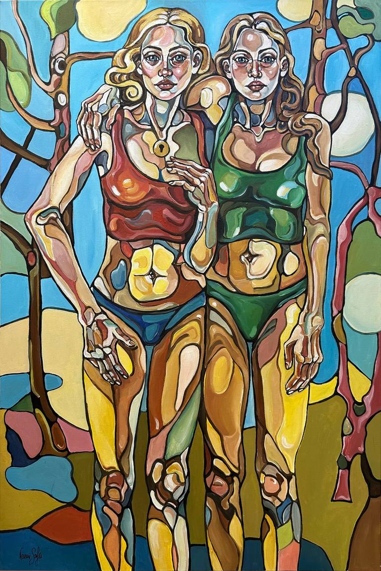 "Until Dawn Breaks" is an original painting by artist Noemi Safir, celebrating the enduring bonds of sisterhood and the quiet strength found in female companionship. This contemporary figurative artwork depicts two women standing side-by-side in a stylized outdoor setting, their arms linked in a ge...