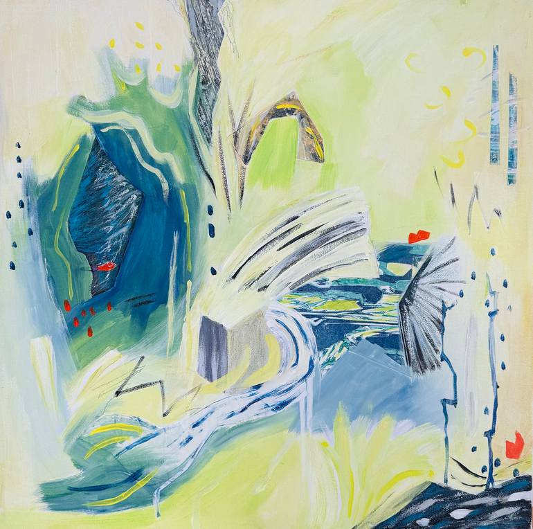 Eliane Saheurs traded one homeland of spectacular mountains for another, and found her artistic voice between ancient stability and endless change. Landscapes, variously abstracted, are her muse, and they crackle action and life. What the viewer sees is up to the viewer, as Saheurs, even at her most literal, makes no orders. Her scale and perspective fire the imagination, and only the artist’s reverence for our rugged land is indisputable. by Peter Simpson March 2021 Eliane Saheurs came to painting through an early introduction to photography, where unexpected things happen in the process of making art, and sometimes make everything better. When a young Saheurs worked with her father in his darkroom, and later in the field and darkroom with her mineralogist/geologist husband, she would have seen how curious shapes appear on fresh prints — those small but larger-than-life echos of dust, an eyelash hair, a smudge on a lens, or a tiny, Cohen-esque crack where the light gets in. The shapes were blemishes, but a blemish can beautify, like the right scar in the right place on the right face. Those serendipitous glitches may have later inspired Saheurs, for such shapes energetically populate her paintings. Here it is not their origin but their purpose that’s inscrutable; who knows what intent is buried in those shapes, what emotions fire those vivid colours, what desires fuels those tireless motions? You can be certain only that the shapes are busy, at times frenetic in their energy, as they spin and fly in all directions. Saheurs was born in Thun, Switzerland. She moved to Canada — trading one homeland of spectacular mountains for another with its own backbone of rock — and eventually she found painting as her artistic voice. She moved to Ottawa in the 1980s and began a decade of study at Algonquin College and the Ottawa School of Art. She worked with names well-known in Ottawa — Blair Sharpe, Kathy Gillis, Jeff Stellick and others — and studied with artists who hailed from New York to New Mexico to Austria to Tokyo. Her work was included in Saatchi’s “Best of 2017” catalogue. It also hangs in the City of Ottawa’s collection, and in private collections across the city’s corporate, legal, political and diplomatic offices — including, not surprisingly, the Embassy of Switzerland.