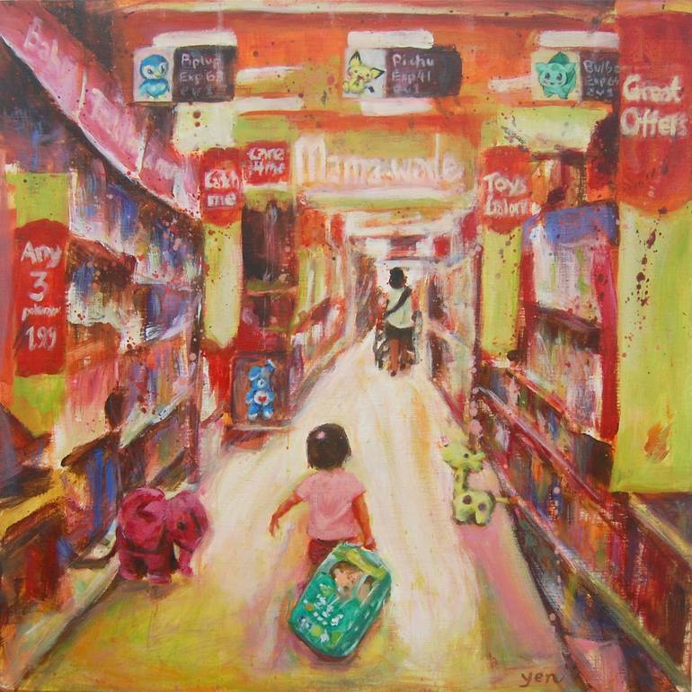 Cute little girl whimsical impressionist painting, shopping in pink pastel colorful fantasy mall with pokemons, care bear, elephant and giraffe toys. True life portrayal of my 1 year old niece and god-daughter whose birth first moved me into starting this Untitled Series, so it was only apt that my ...