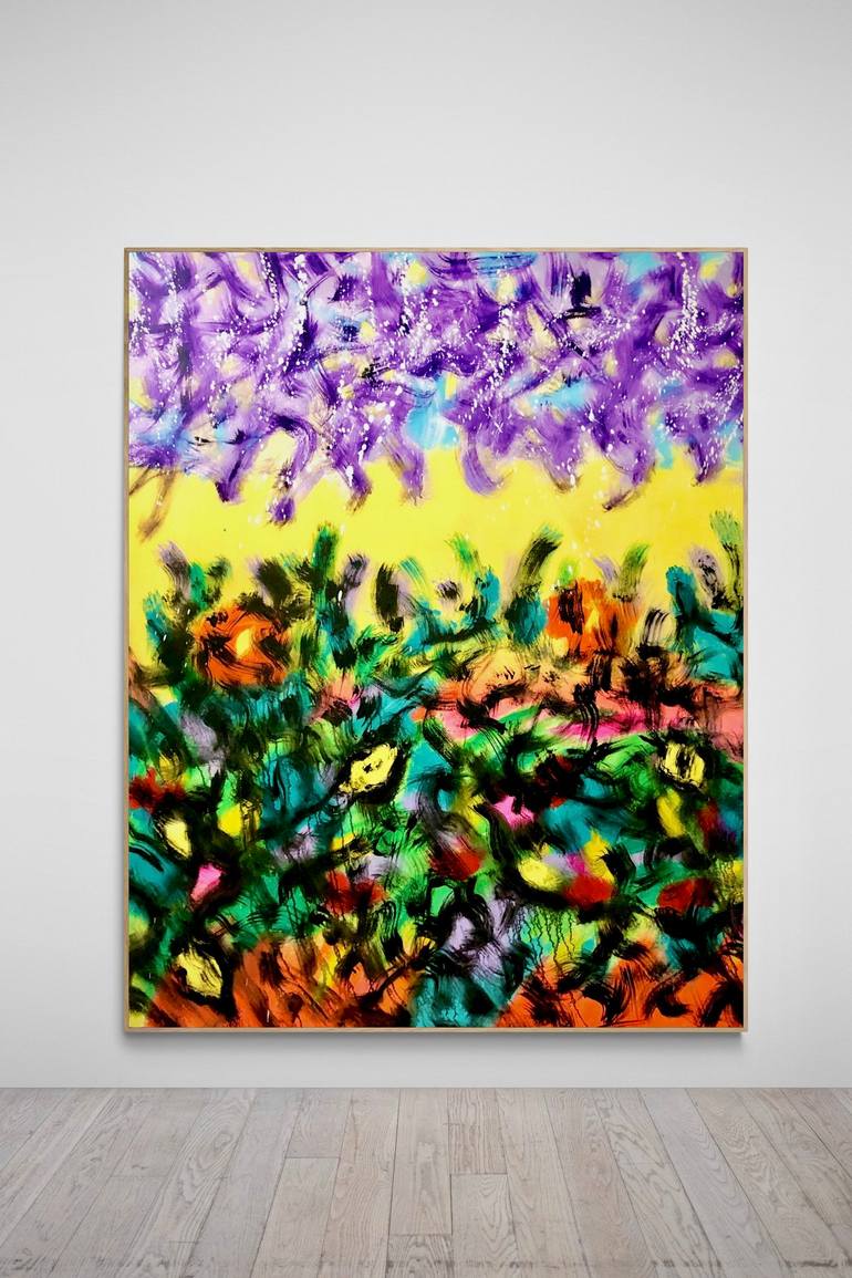 This painting was painted listening to Jazz music. My brush dances with the rhythm of the music above the canvas.Charlie Parker’s bird is the tune i painted the black brushstrokes over the abstract landscape. My palette is inspired by Henri Matisse, my ductus by Joan Mitchell.
