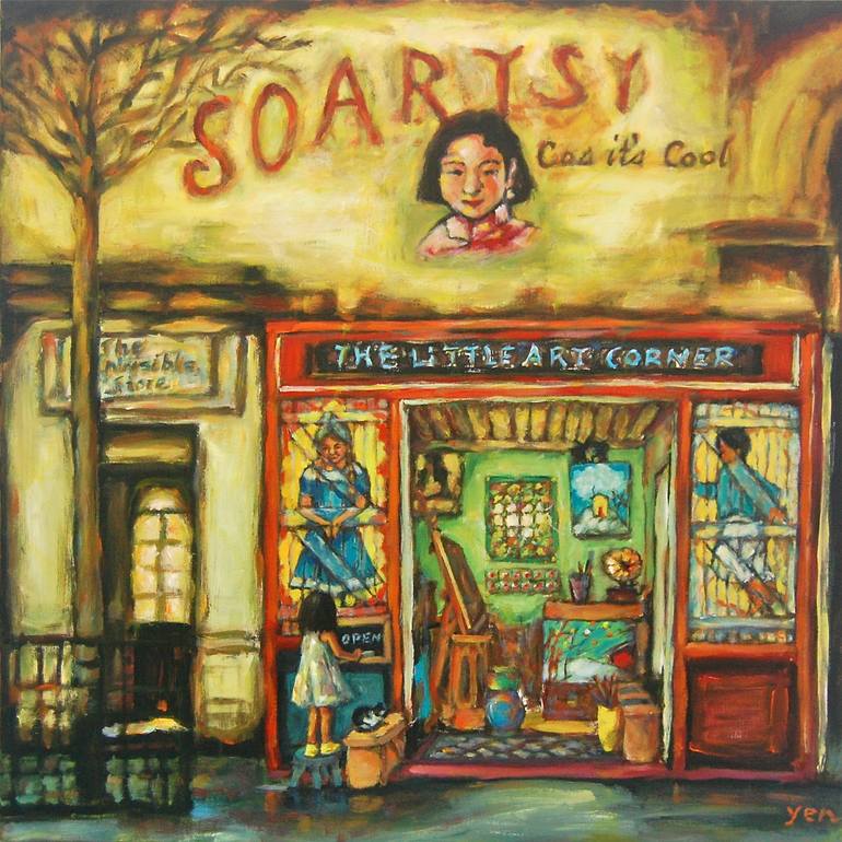 Warm vintage painting of cool art shop with little girl and sleeping kitten, under a So Artsy sign and Chinese woman portrait, a quirky artist's haven with painting easel that is inspired by my dream art corner. A work from the artist's “Untitled Series”, based on the central theme of being a child...