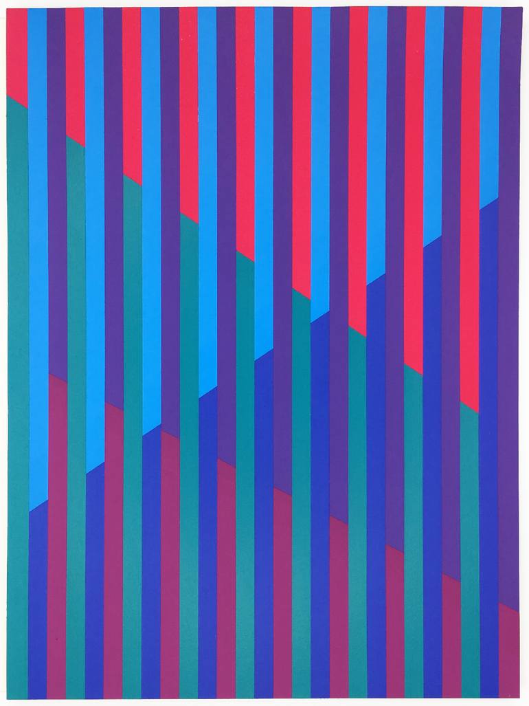Acrylic on Arches Hot Press Watercolor Paper Layered and alternating stripes of color are constructed to create a spatial effect of overlapping planes. Part of the Interlace series, exploring the interaction of colors and the sensations of depth and movement. In each work, several groups of rhyth...
