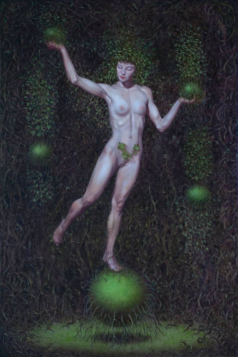 This painting is inspired by the ancient greek mythology of nature and wood nymphs called Dryads. The model who posed for it is an acrobat and a practitioner of the Japanese traditional art of kokedama.
