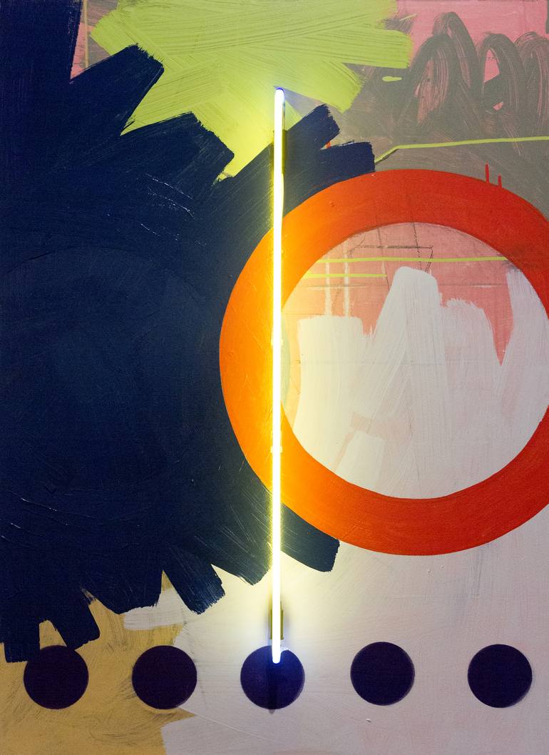 This 2019 painting back, such as composition albeit elements, letters, graphites, prints and neon light as motivators of creation. Here I seek to talk about the urban landscape, the city and the excess visual communication of an urban center The painting is in MDF wood, neon light with electric bond...