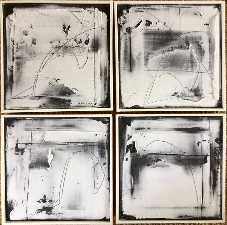 Series of 4 modular works, each 12” x 12”, available separately but priced as a unit. These works are highly textured explorations of white plaster against a contrasting black background. The linear incisions add an extra layer of interest and complexity. Upon closer inspection, you’ll notice the su...
