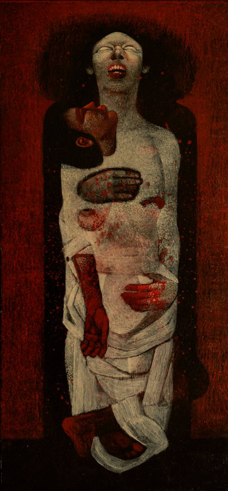 My paintings are kind of notes of special moments in which I was able to be sufficiently open to a deeper understanding of myself and the people close to me, our actions and feelings. It's an attempt of an inner man portraiture. Therefore, it seems to me, occurred a need for simplified figuration, deformation, omitting parts of the face and body, as opposed to how we humans are accustomed to perceive each other in our physical environment. Is it actually possible to express abstractness of emotions and ideas about man by painting the human figure? In what way and how much these ideas are, concerning growing up in the community, education and cultural heritage, visually formed in our minds? As god is depicted in human form, because that is what our minds can comprehend and feel familiar to, I spontaneously choose to describe the spirit as something equally human too, but also strive to get out of these boxes. The picture that balances on the imaginary boundary of physical and spiritual, for me, is a form of connection and communication with other people.