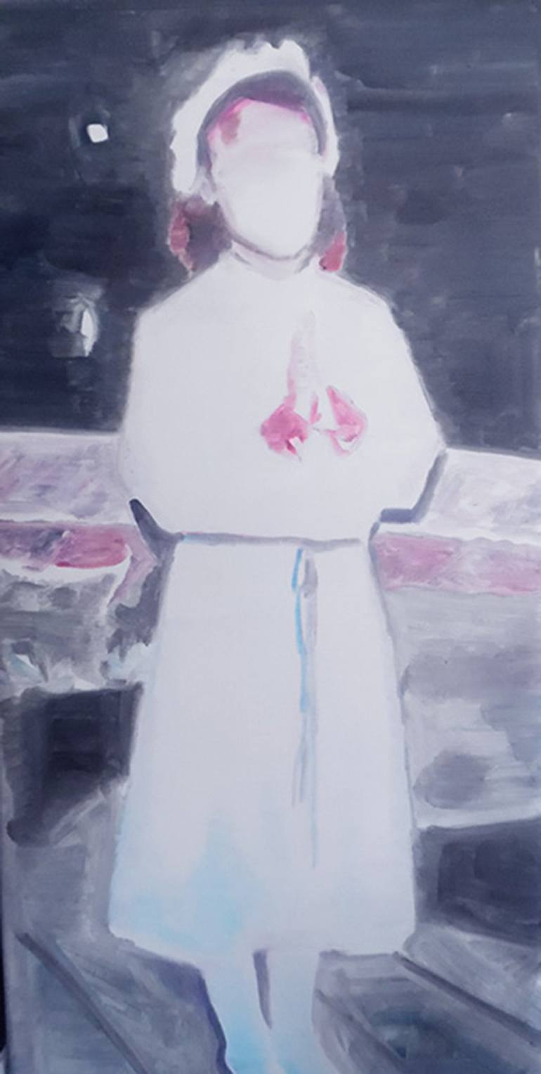 The work portrays a young Italian girl beatified in 2008 on the day of her communion. The faceless figure seems to shed its anonymous character to take on a pacified and at the same time mysterious meaning