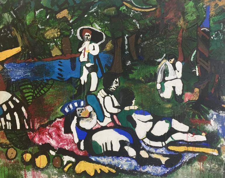 The image was inspired by Picasso's interpretation of Manet's 'Luncheon on the Grass' series. The artist hopes that it will create a vibrant, uplifting mood, one that invites thinking and fuels imaginative speculation. Thick acrylic painting and texture paste is often underused in art. This paint...