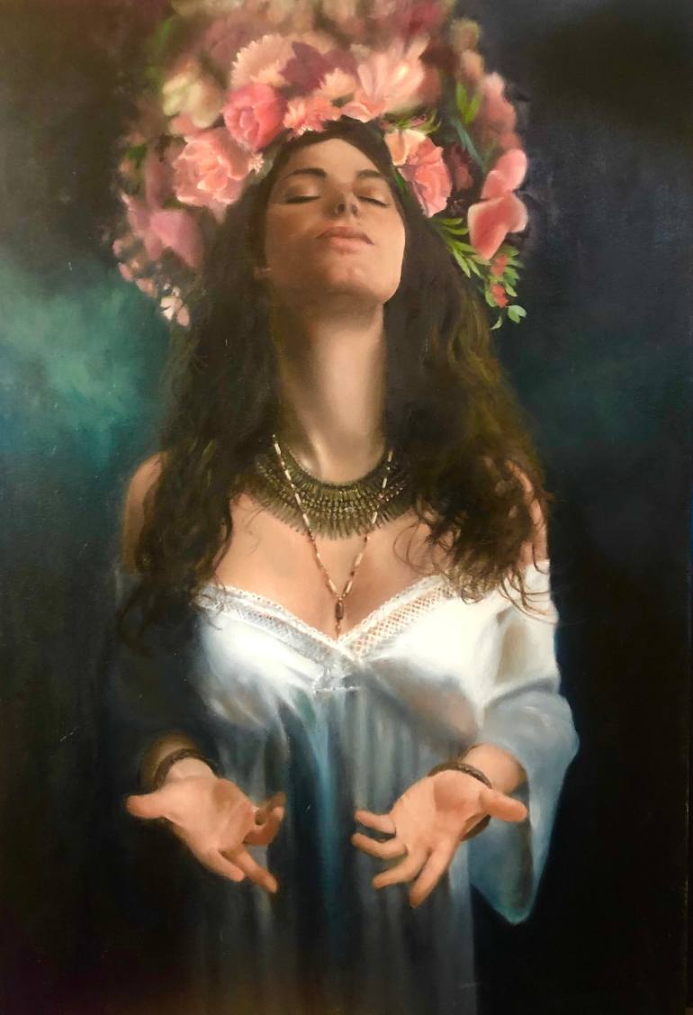 This was a concept I worked on for 2 years. I photographed the model and began with a drawing on the canvas. It wasn’t until 2021 that I began working on the painting. I wanted to capture an emotional expression without specificity. I also purchased the dress the model is wearing for this work.