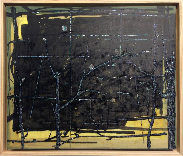 Silk dyeing of Korean dendropanax leaves and stems, powder color, ink, mother-of-pearl, wood framed
