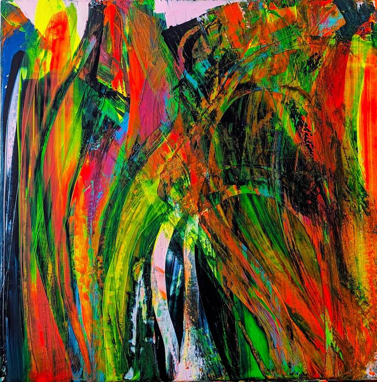 The artist chooses a background color for inspiration before diving into his painting process. This sets the mood and all other pigments selected are influenced by the the background. This painting is made up of layers and layers of contrasting colors that seem to be moving across the canvas.