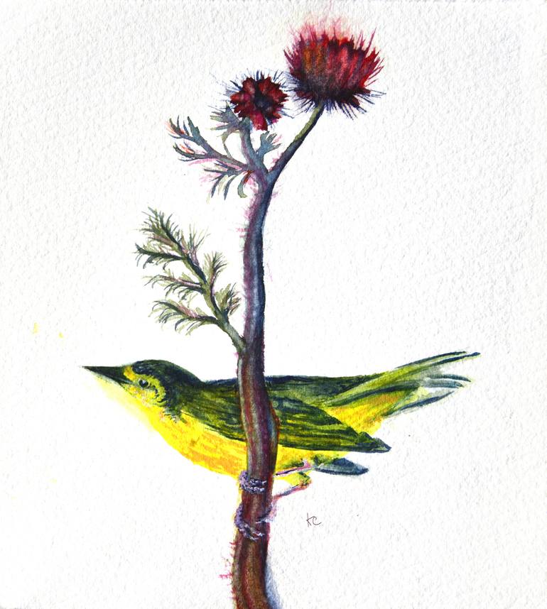 Artists watercolor on handmade watercolor paper. 11.5 cms x 12.2 cms A tribute to Audubon with a surreal twist.I think the stem must have been living in the recess of my mind and looks a bit like something from Bosch. The bird seems quite happy with it however.