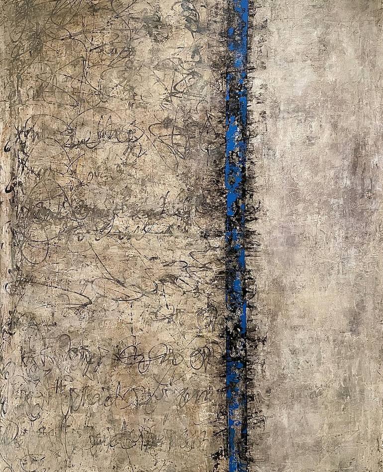 Neutral tones dominate the palette, creating an atmosphere of equilibrium and neutrality. However, amidst this subdued backdrop, overlays of bright cobalt blue punctuate the composition, injecting bursts of energy and intrigue. This painting serves as a visual exploration of duality, communication,...