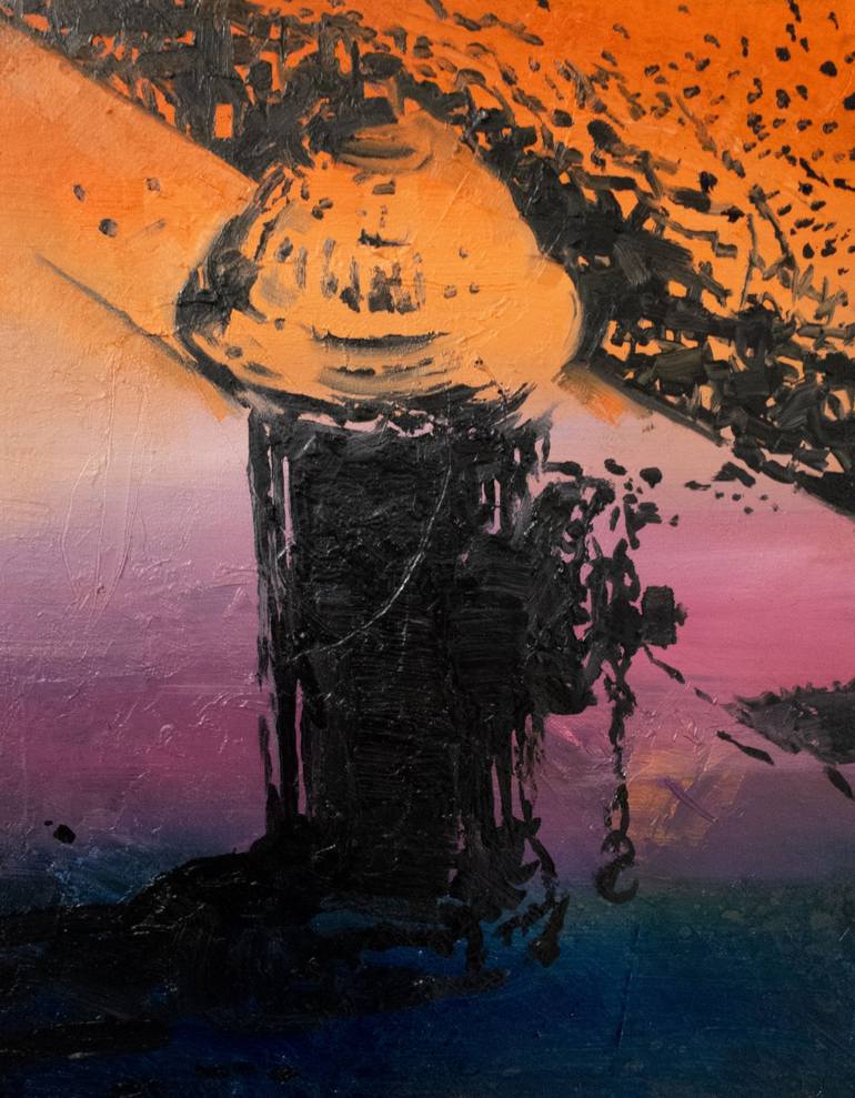 In Urban Sentinel, Benites transforms a humble fire hydrant into a striking symbol of resilience against a backdrop of shifting color and light. The bold, impasto strokes of black create a commanding silhouette, while the gradient wash of orange, violet, and deep blue evokes the changing moods of th...