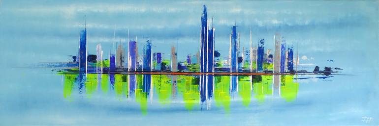 Acrylic on canvas with gloss varnish. «3D» wood frame (1.5 inches sides painted in white – no need to frame). A "cinemascope" composition where blue and green evoke a city hanging above water or in the air. Background was done with a large brush, mixing blue and white. The "city" (or whatever your ...