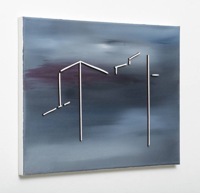 „Urban World Sihouette“, 11,8x15,7x1,5 (attention these are the correct dimensions) inches, oil on canvas with painted lasered wood. The Silhouette is a lasered drawing of a skyscraper in Berlin/ Germany. It is lasered out of wood and painted with oil colour. In the background is kind of a nighttime...