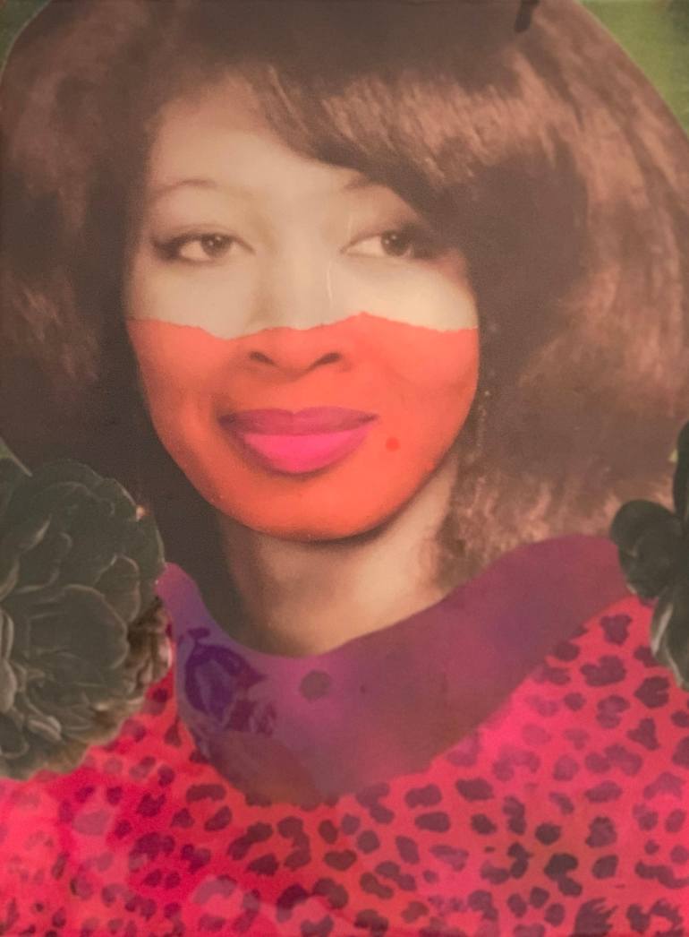 Part of my Mixed Media Family Series. I call this series Family Quilt this is where I reimagine vintage family photos and combine them with my Pop Art style and my Grandmother's Fabrics. This painting is inspired by my Aunt Lois.