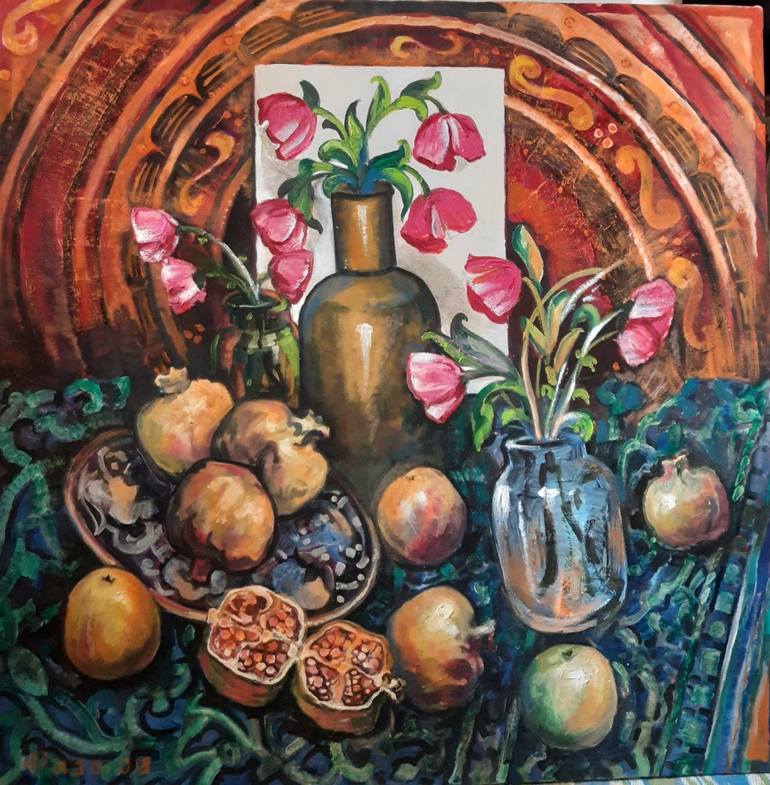 I was inspired to write this work by beautiful and delicious fruits in my country and this work is much suitable for stand in halls, living-rooms, to be part of collections.