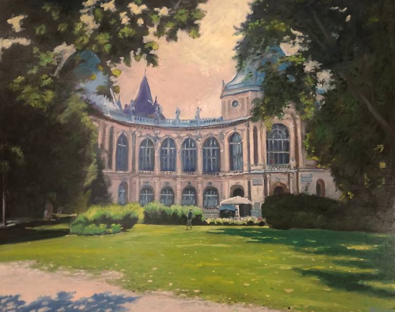 Impressionist painting of a castle in Budapest. The figure gives a good impression of the building's size. Lacquered, framed. The play of light and shadow weaves through the painting, which is why it is special and airy.