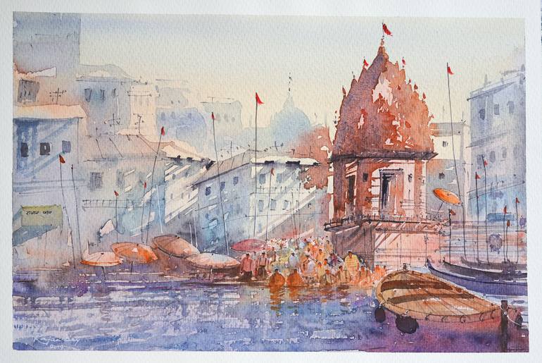 This is a beautiful painting of Varanasi Ghat, India on Saunders waterford 300 gsm artist paper using artist watercolor paint. Painted using artist quality paint from Windsor and Newton, Sennelier, Van Gogh.