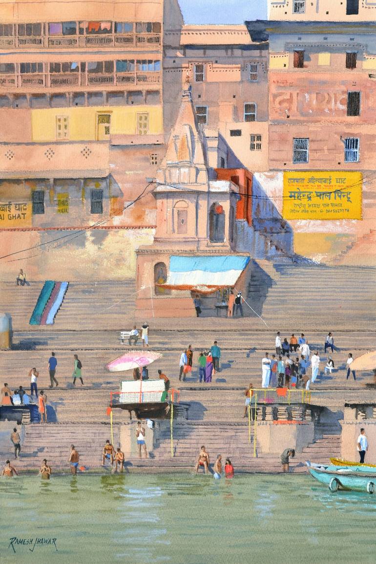 The ghats of Varanasi have been painted umpteen times yet they never cease to inspire the artist. I wanted to capture the ebb and flow of the activities on these ghats on a typical day. The motionless solid structures of the buildings in the upper half provide a nice contrast to the flowing motion o...