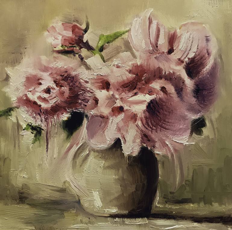 Study in oil on Ampersand gessobord of a vase with pink flowers.