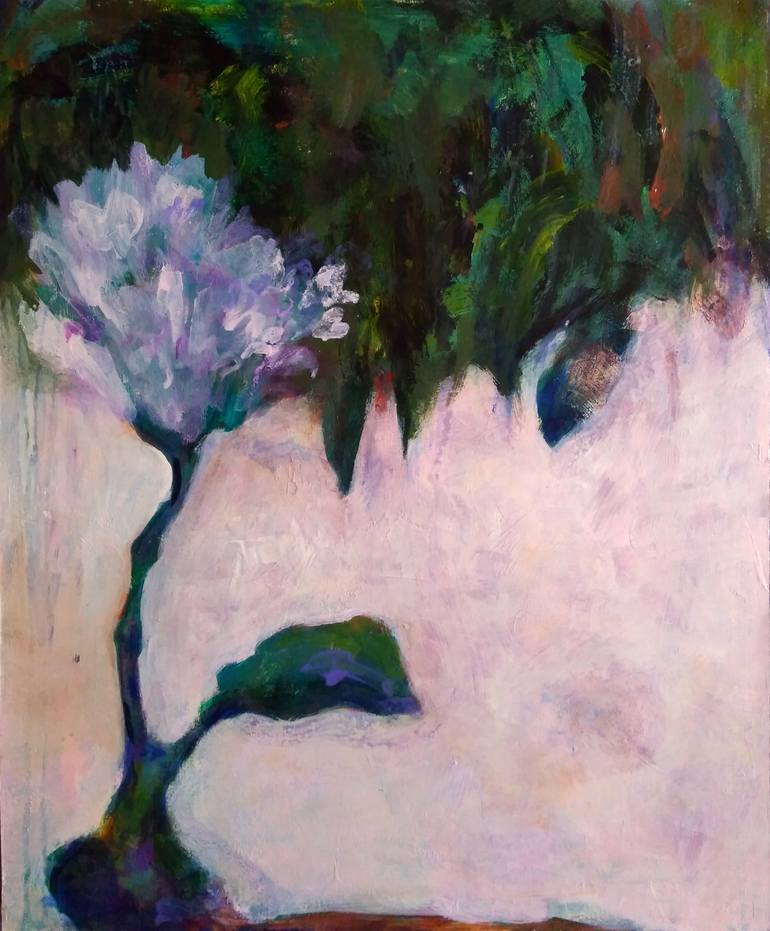 Vegetal : A flower blooms, greenery on a pink relaxing space. acrylic painting on gessoed chipboard panel, ready to hang. Gloss varnished. Will be sent carrefully packed on a cardboard box, with his certificate of authenticity. The sides are painted on grey tones and it can be hanged without frame....