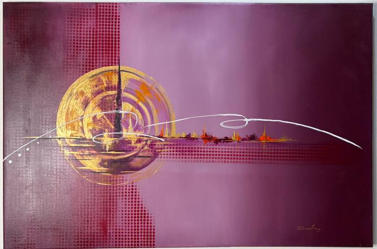 This artwork, titled Veil of Eternity, is a stunning abstract composition that radiates a sense of cosmic energy and balance. Dominated by rich shades of purple and crimson, the piece is punctuated by a glowing golden circular motif that appears to ripple outward, evoking the image of a celestial or...