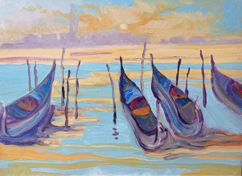 Venetian boats. Blue and yellow landscape. Venetian sunset. I guess I am a lucky person. Because being an artist is a great gift and opportunity. I live in Ukraine and when the war started, I absolutely did not want to leave the country. The big city of Dnipro suddenly became empty. Buildings in th...
