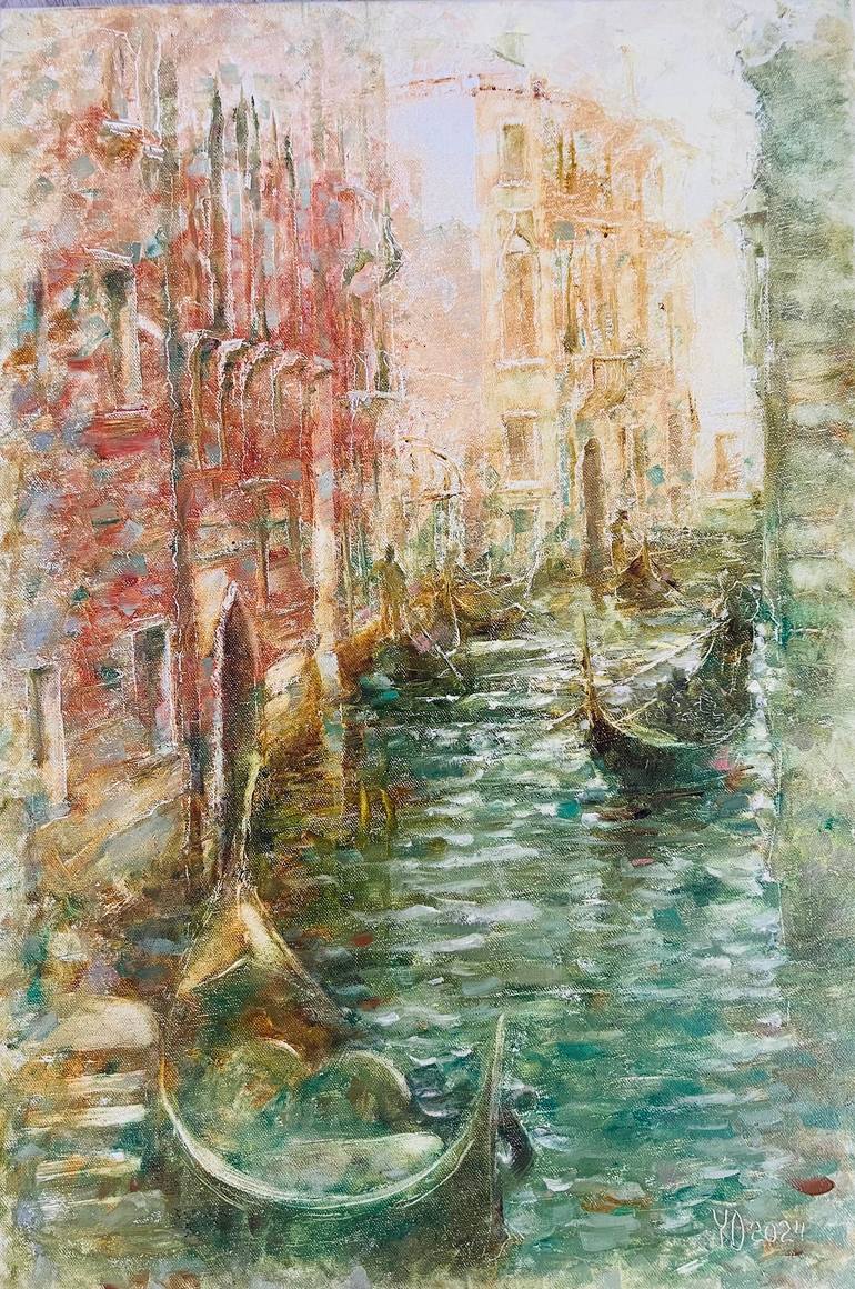 Italy Venice Gondola Art – Nostalgic Coastal Landscape, Grand Canal Boats, Terracotta & Ochre Romantic Cityscape Sun rays slip between old Venetian buildings, awakening quiet, thoughtful streets. Gondolas glide gently along the Grand Canal, catching warmth and light. This romantic impressionis...