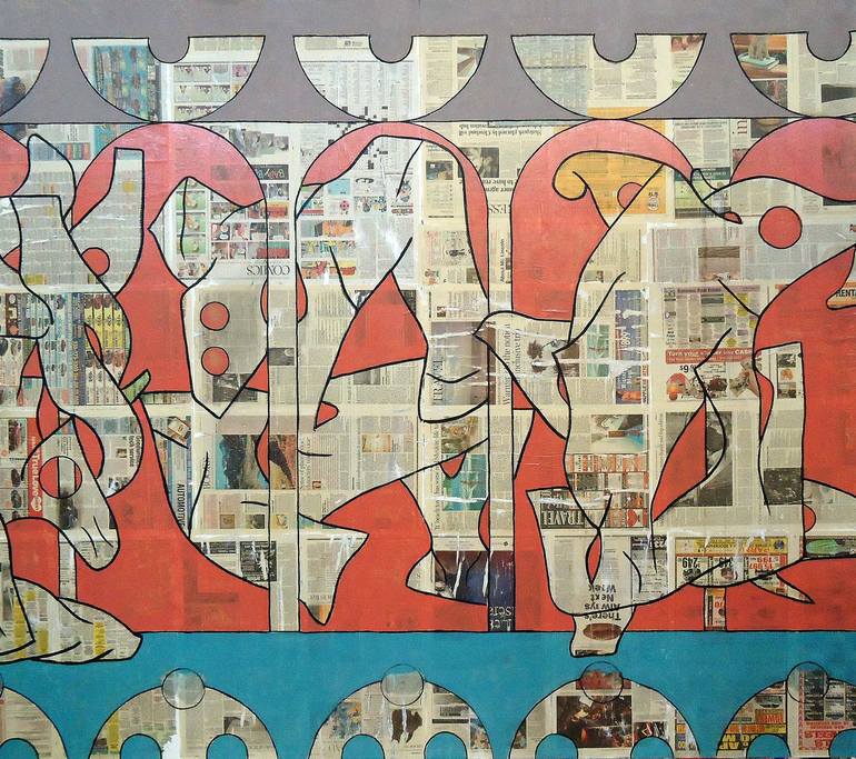 Enamel and newsprint on stretched canvas.(diptych) Ships in a wood crate ready to hang with hardware included.