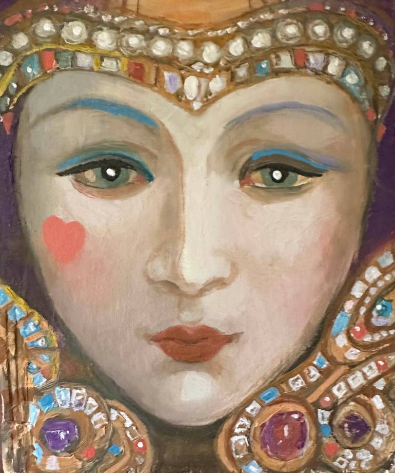 An altar image of goddess in a form of Venus, made on wooden board. Effeminate face with a heart on a cheek, surrounded by pearl and gem incrusted golden jewerly.