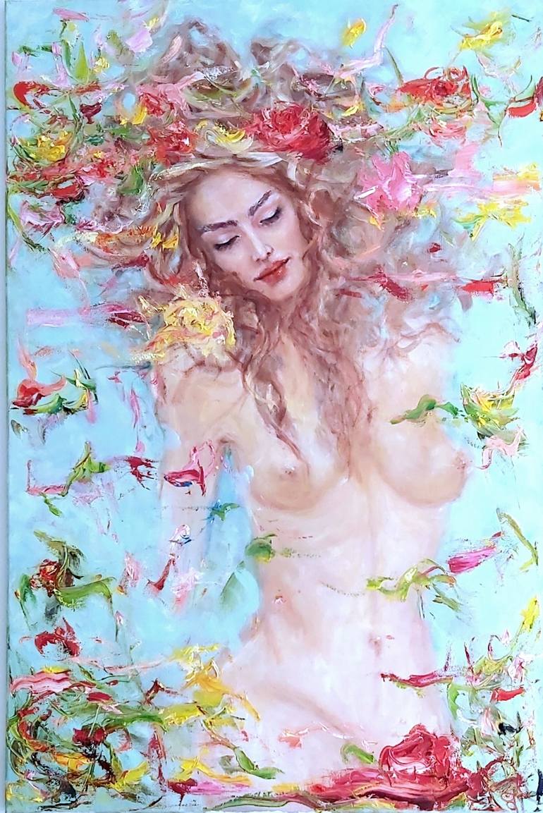 Another image of female beauty by the author. This Venus is different from the Venus of the old masters, for she is the embodiment of the femininity and sexuality of the modern woman, yes, she is the goddess of love, floating in clouds and flowers. The author deliberately uses abstract elements to...