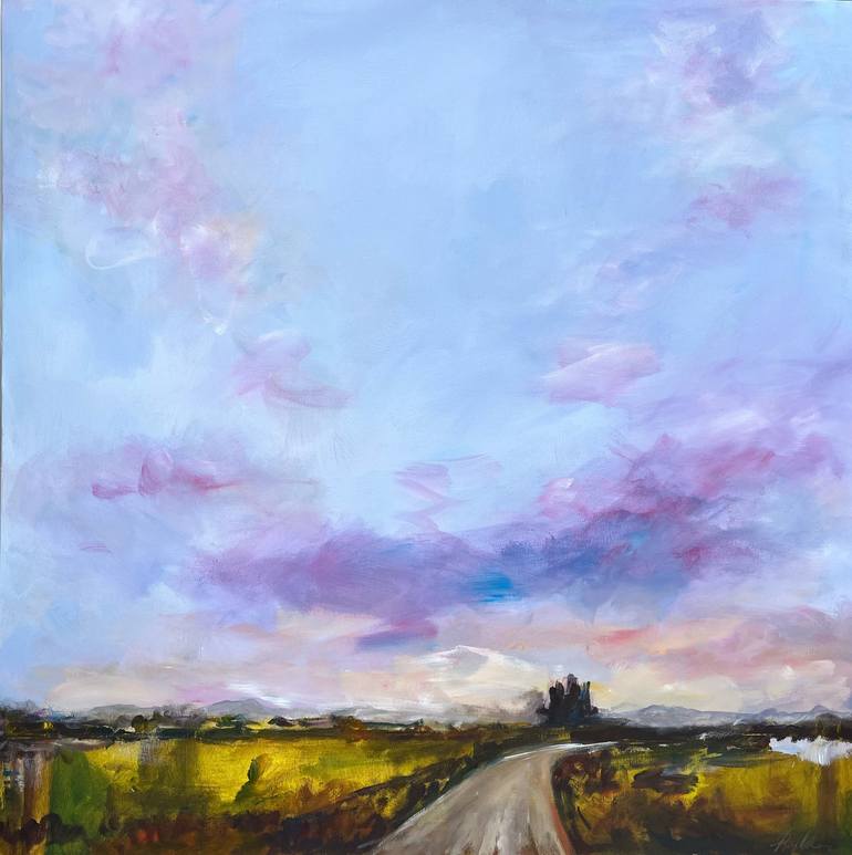 Certo! Ecco la traduzione: This painting represents a long walk home, gazing at the mountains and the colors of the sunset. When I look at nature, I relax, observing the colors and imagining them on canvas. In this case, I tried to use acrylics, employing calming colors to best describe my state of...