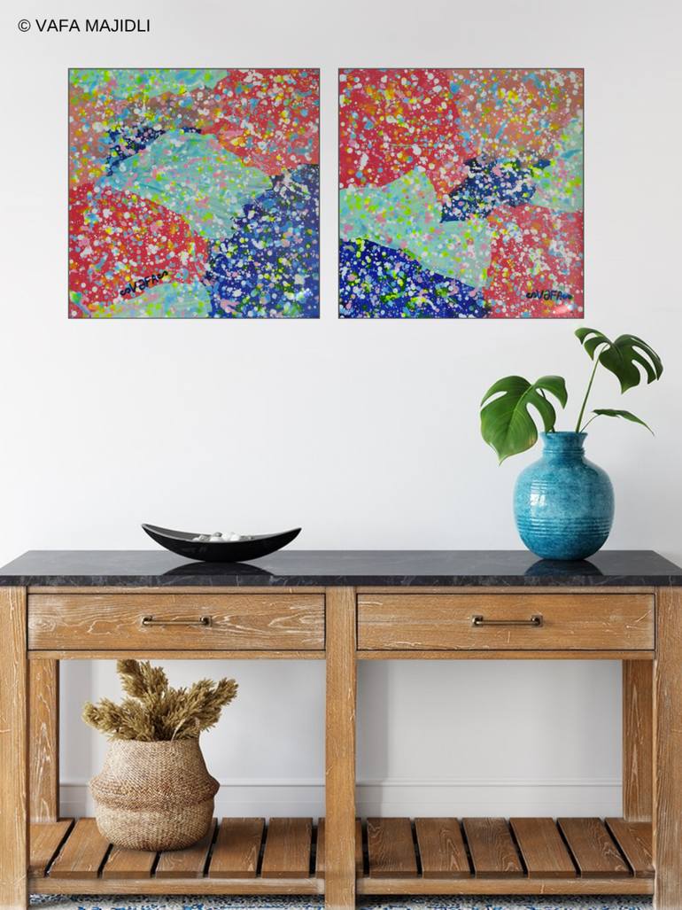 "Vibes of Joy" is an enchanting and vibrant abstract diptych that vividly captures the pure essence of happiness and celebration. Bursting with an array of lively, bold colors, it invites viewers on a captivating visual journey into their own unforgettable moments of bliss and warmth. The diptych fe...