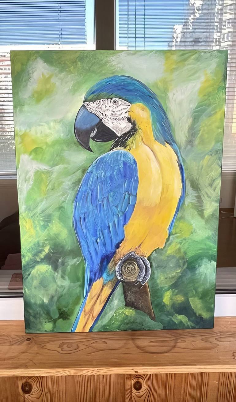 This painting immediately draws you in with the vibrant blues and yellows of the macaw, each feather meticulously rendered, giving them a softness that invites touch. The parrot’s gaze is intriguing, almost playful, set against a lush, blurred green backdrop that suggests a tropical habitat, evoking...