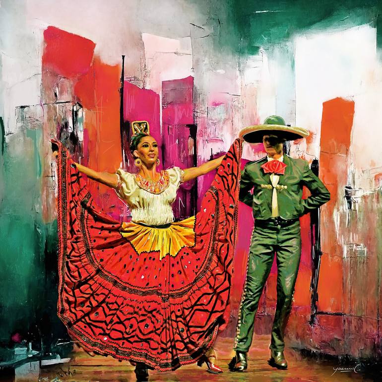 A vivid depiction of traditional Mexican folk dancers in elaborate costumes, performing against an abstract, colorful urban backdrop that highlights the cultural richness and energy of their performance.