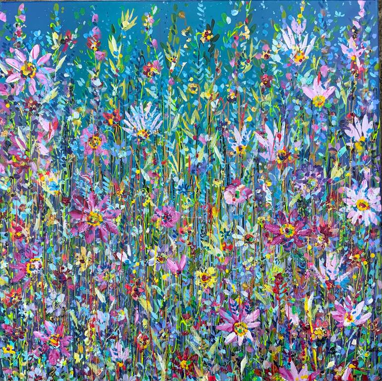 A highly textured and vibrant flower meadow adorned with dazzling jewel like flowers, metallic gold highlights their detail. Teals, blues, work with pinks and lemons to create a dazzling burst of colour and energy which is vibrant and uplifting. Painted with a contemporary approach onto a stretched ...