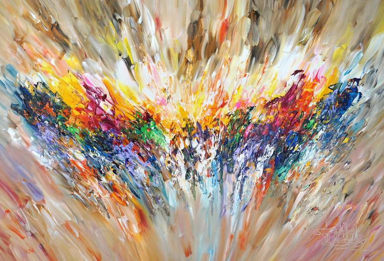 Large abstract painting. Original abstract expressionism art. 61.0" width x 41.3" height x 1.5" depth. (155 cm Breite x 105 cm Höhe x 3,8 cm Keilrahmenstärke) White, yellow, blue, magenta, pink, green, orange, lavender, violet, beige, brown. Modern, colourful abstract artwork. It was painted with ...