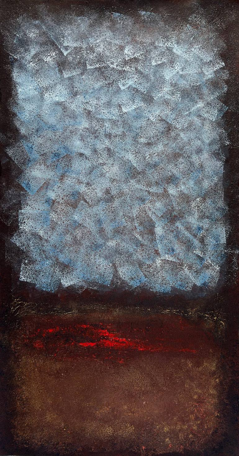 This abstract artwork merges cool and warm tones, symbolizing contrast and transformation. The textured blue-gray area evokes ice and mist, while the dark brown and red segment suggests fire and depth. The blend of colors and rough textures creates a visual balance between cold detachment and raw in...