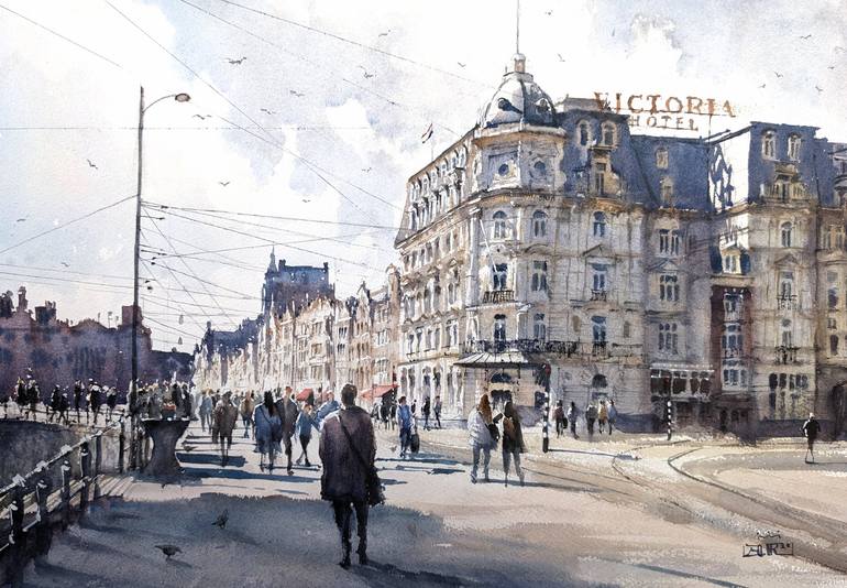 One of the first sights when entering Amsterdam, the grandiose Victoria Hotel at the Damrak, illuminated in the light of the sun. Watercolor on archival quality paper. Unframed.