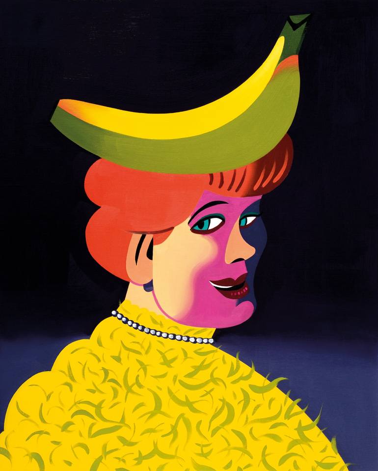 A few years ago I painted another victorian lady with a banana as a hat. This time the canvas is bigger and the girl is happier.