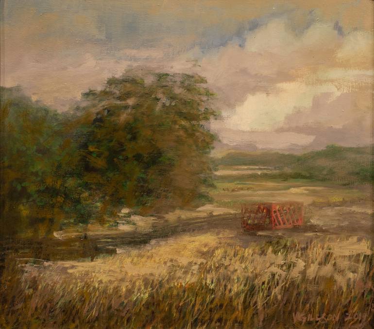 This view is one of many around Huron County where a pastiche of crop fields and dairy farms stretches over the horizon. The painting is on an oil ground on stretched canvas, signed and dated.